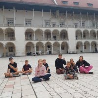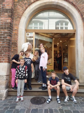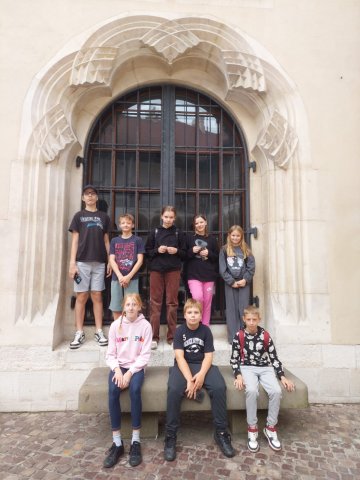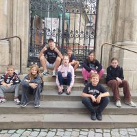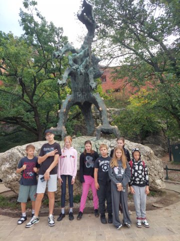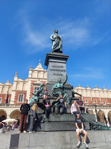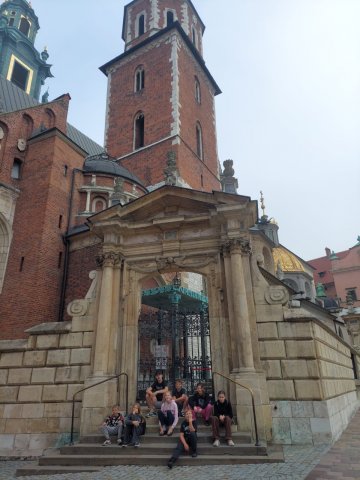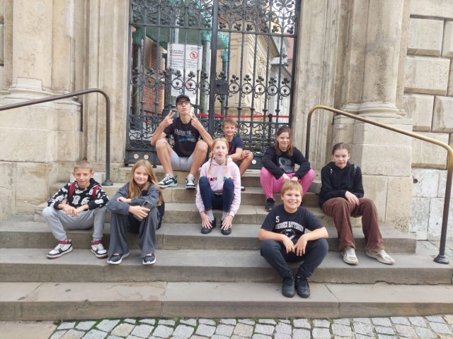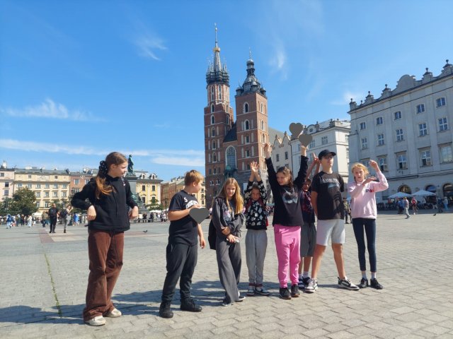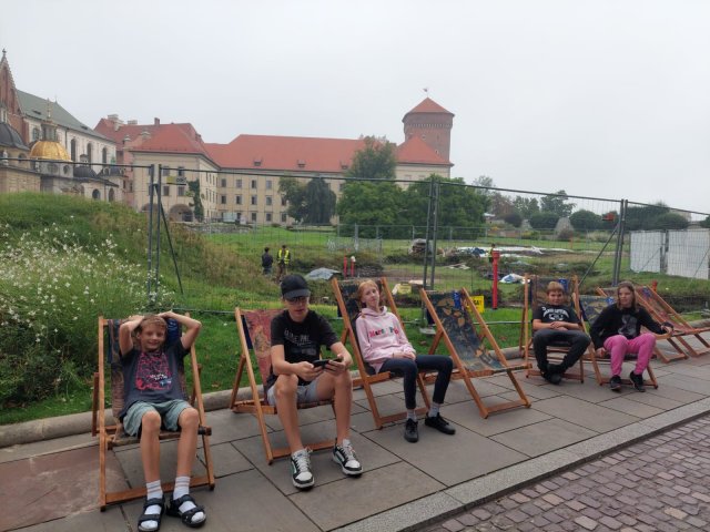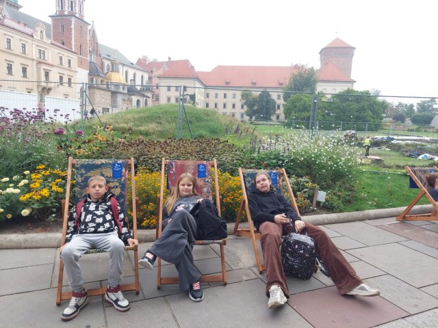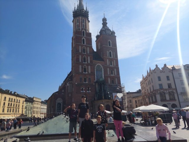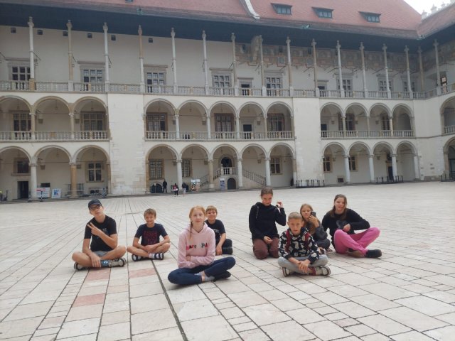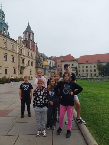 11.09.2025Uczniowie klasy 4a i 5a zabrali Panią Bożenką i Panią Anię na super wycieczkę na Wawel. Najpierw przeszliśmy wszystkie magiczne miejsca samego Zamku – na Wzgórzu Wawelskim przemieszcza się jak zawsze mnóstwo turystów, kość Smoka Wawelskiego nadal wisi u wejścia do Wawelskiej Katedry, potem odwiedziliśmy Smoka – ma się świetnie, nadal zionie ogniem! W zasadzie od spotkania ze Smokiem zza chmur wyjrzało słońce! Wraz ze słońcem poszliśmy na Rynek, tutaj również ruch turystyczny ma się świetnie. Sprawdziliśmy czystość słynnej fontanny, zabójczy nóż wiszący we wnęce Sukiennic i napełnieni słońcem wróciliśmy do szkoły na pyszny obiad – było super, bo byliśmy razem!