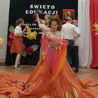 W kolejnej odsłonie na scenę wkroczyli Uczniowie klas: 3za, 3zb, 3zc oraz 2z, którzy pięknym występem powitali swoich najmłodszych Kolegów. Na scenie pojawiła się Pani Jesień (w tej roli nasza Tosia), która wraz z Uczniami zaprezentowała wiersze, piosenki i „jesienny taniec”, wspólnie przekonując najmłodszych Uczniów, że „nie ma czego się bać”. W kolejnej części niezwykłego show Uczniowie klas: 3a, 3b, 3c oraz 2z zaprezentowali magiczny taniec rodem z „Jeziora Łabędziego”.