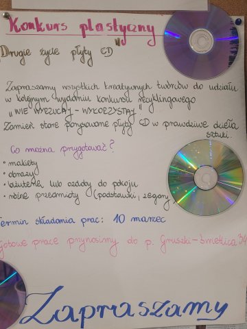 W styczniu rozpoczął się w internacie cykl zajęć Kółka Plastycznego Junior, skierowany do wszystkich chętnych wychowanków zainteresowanych twórczą aktywnością i rozwijaniem zdolności artystycznych. Na pierwszych zajęciach wykonywaliśmy prace konkursowe inspirowane ideą recyklingu. Do ich stworzenia wykorzystaliśmy stare płyty CD, które stały się bazą do kreatywnych i oryginalnych projektów. Zajęcia były okazją do rozwijania wyobraźni, ćwiczenia sprawności manualnej oraz zwrócenia uwagi na możliwość ponownego wykorzystania przedmiotów codziennego użytku.